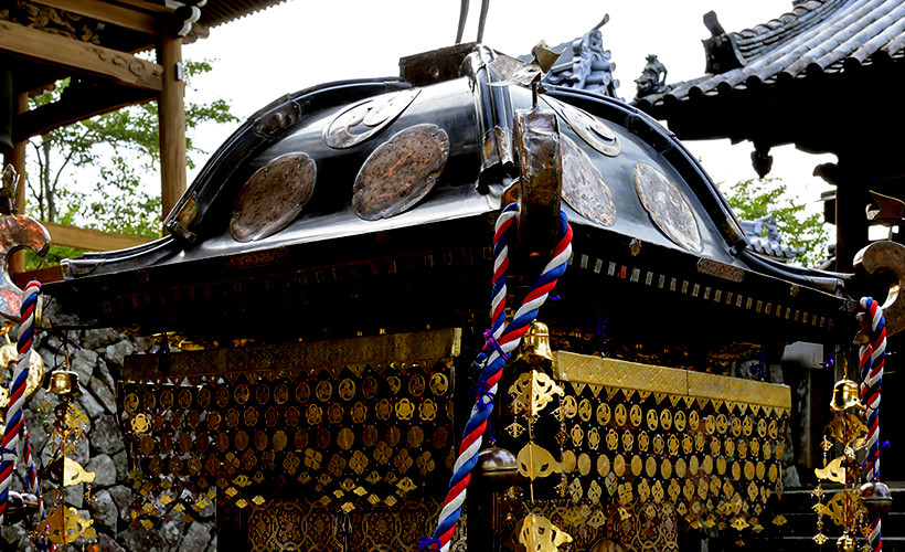 黒漆塗りを施した屋台は、繊麗な真鍮金具が随所に打たれ、重厚感のある美しさ。いずれも車輪軸に土台を載せて床をつくり、欄縁を載せ、勾欄を組んだ二階建てです。