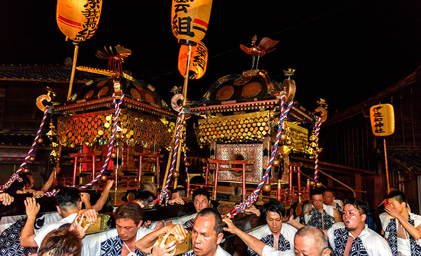 伊佐和神社から2基の御輿が町を巡行し勇ましい掛け声とともに、神輿が左右に大きく揺れる「横ゆすり」、上下に揺らす「縦ゆすり」が男衆によって繰り返されます。大小12基の屋台は、夜になると提灯の灯りに照らされ優雅な姿を見せてくれます。