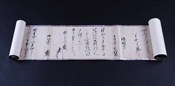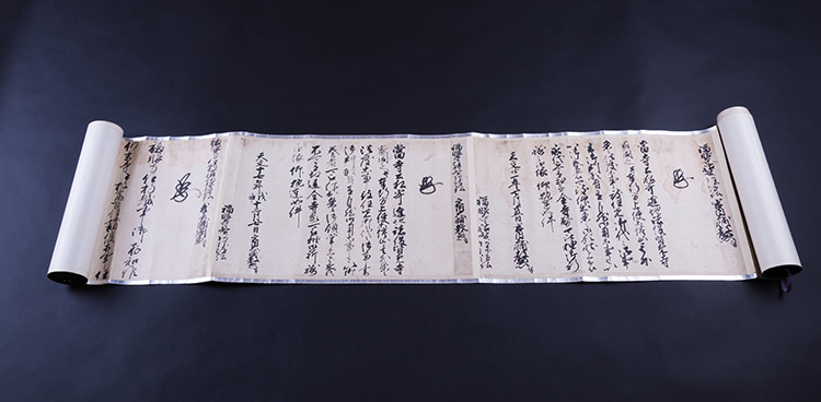 明治11年、射和寺が廃寺となったとき、竹川竹斎が北畠国司家が射和寺に与えた古文書の散逸をおそれ、射和文庫に保存したものです。巻子装で、第1巻は縦31.5cm、横960.0cm、20通。第2巻は縦26.0cm、横902.0cm、21通。