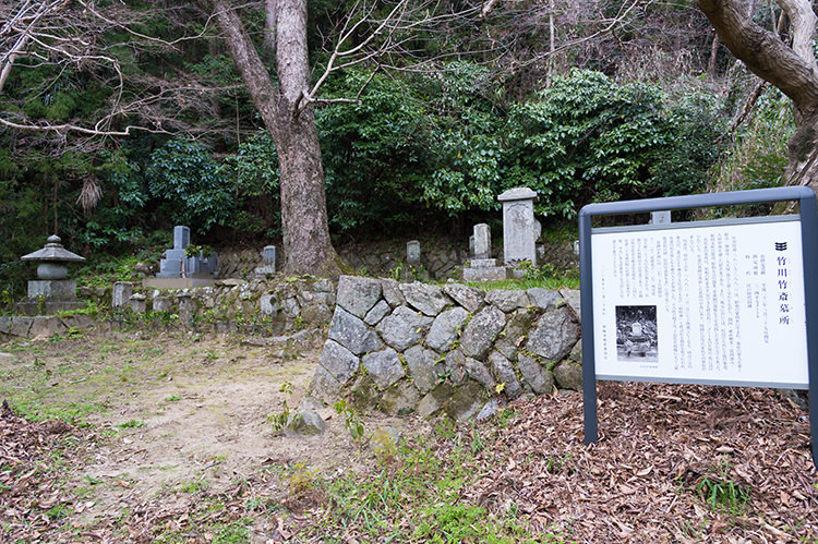 射和の町並みを一望する標高約32mの丘陵に、竹川家の墓所が設けられています。竹斎の墓碑は南面した墓所の中央にあり、周囲に竹川家代々の墓石が並びます。竹斎は明治15年(1882)11月1日没、同月3日の葬式は遺言により神式でも仏式でもない形式で行われ、「政胖葬(まさやすそう)」と呼ばれました。その時の様子は、子息・竹川政悌によって『射陽書院目録 竹川竹斎畧年表』に記されています。