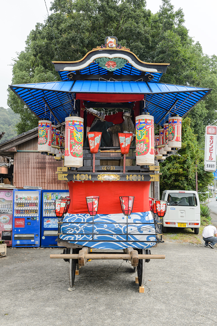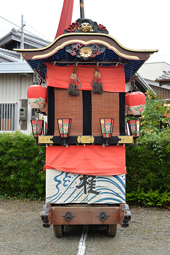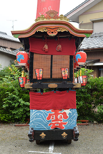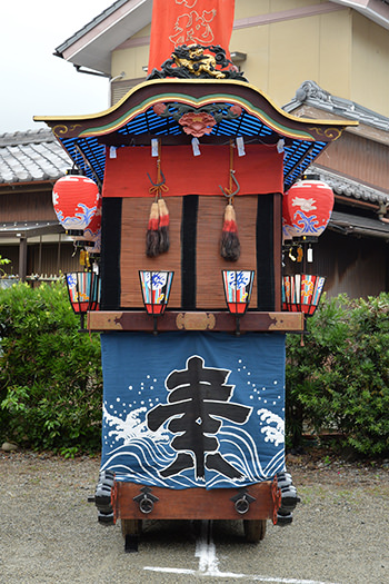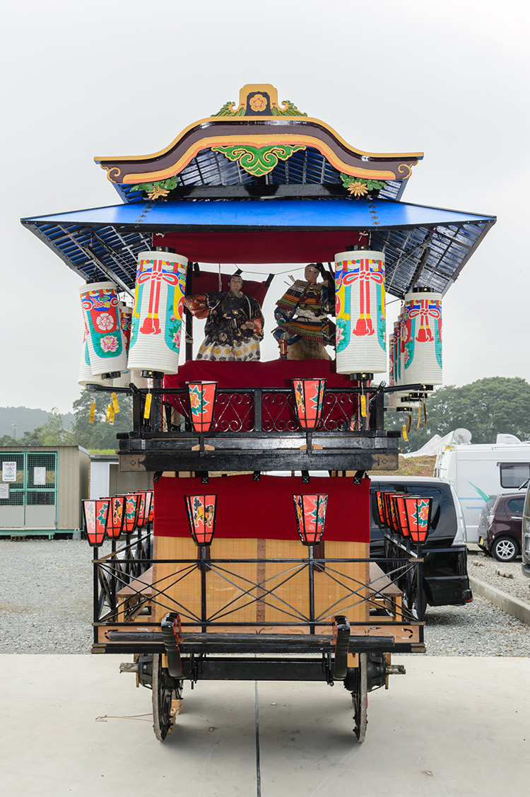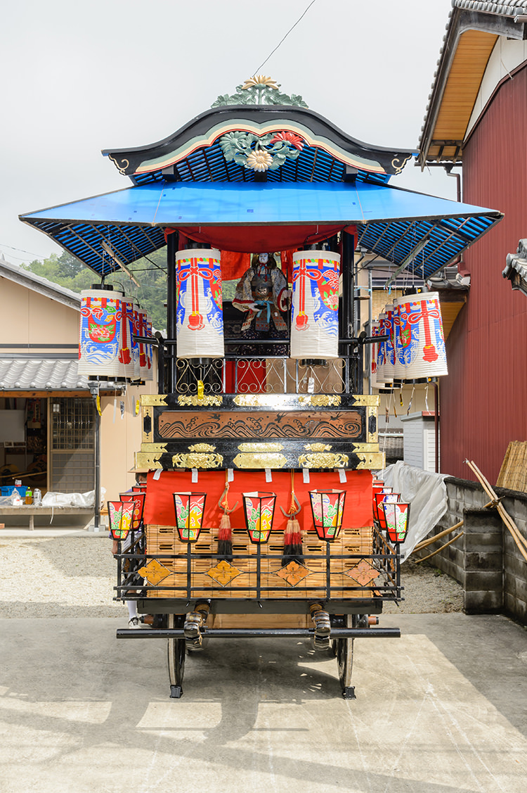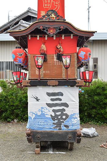 大屋台に「寛政五年癸丑(1793)六月吉日」の墨書きが残されています。鬼板の文様は牡丹、懸魚は菊。人形は神功皇后(じんぐうこうごう)、応神天皇(おうじんてんのう)、武内宿禰(たけのうちすくね)と、3体並びます。屋台後部に掛けられる見送り幕には富士に龍を描きます。小屋台の鬼板文様は獅子で、懸魚は菊。