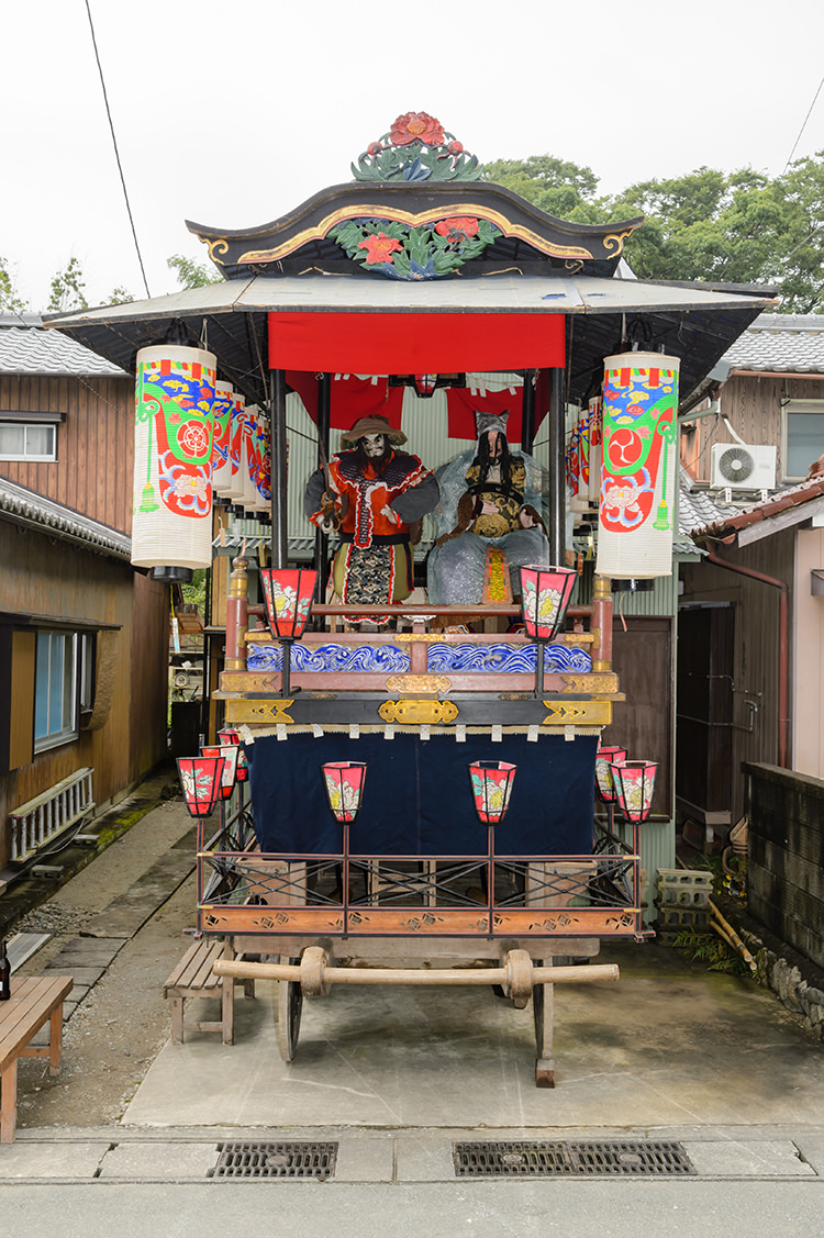 安永9年~天明元年(1780~1781)製作の大屋台は、町内で最も古い年代です。鬼板の文様は赤い牡丹を飾り、懸魚に対の牡丹が破風板に下がります。中の人形は『三国志演義 』に登場する関羽(かんう)と張飛(ちょうひ)で、人形も一番古いといわれています。小屋台の鬼板文様は獅子で、懸魚は菊。